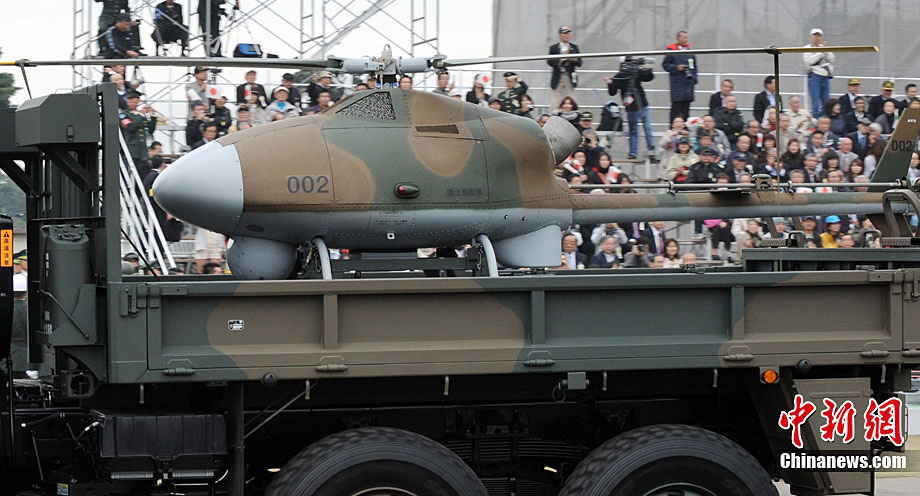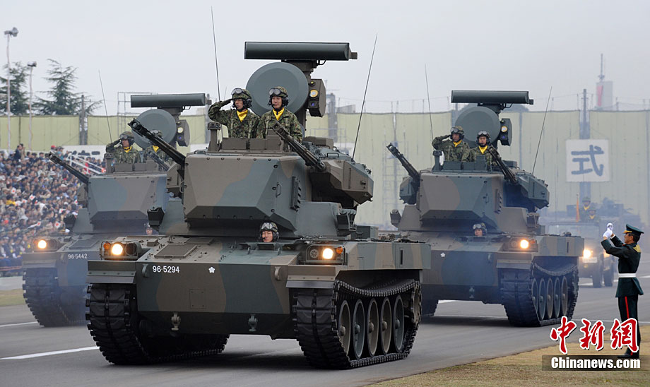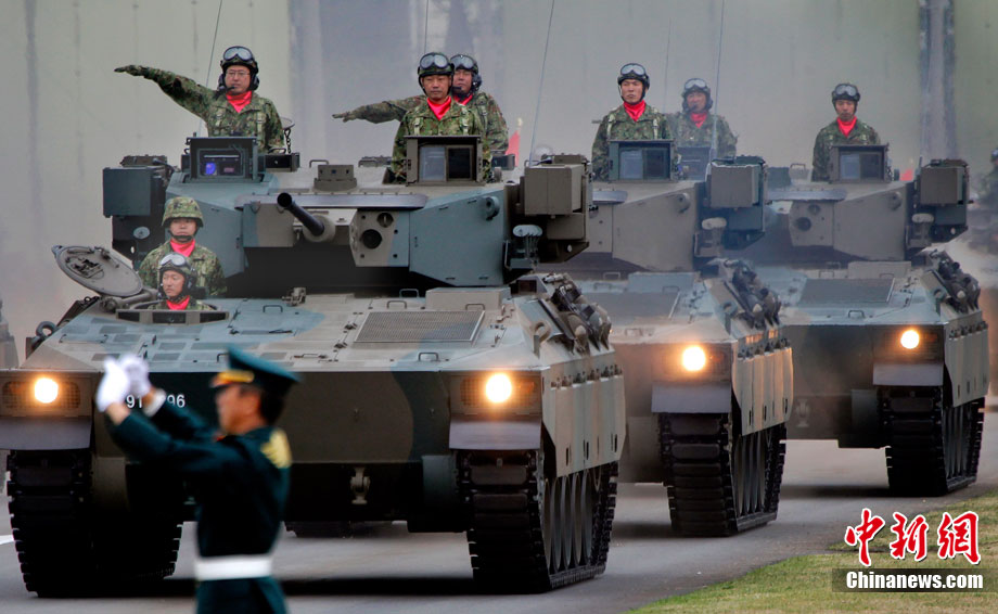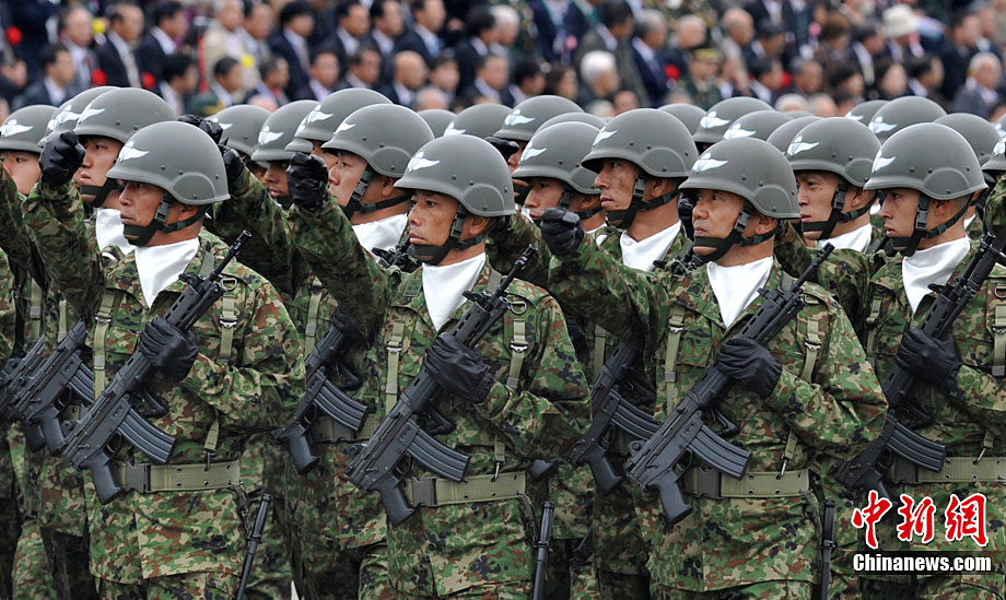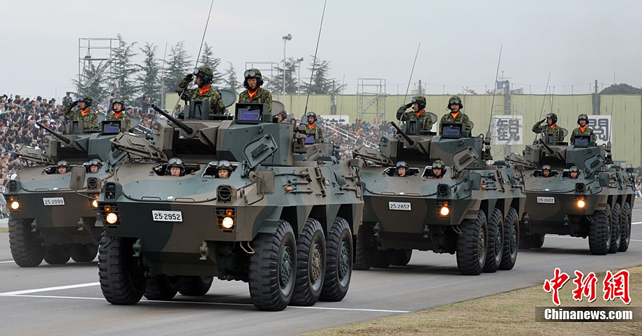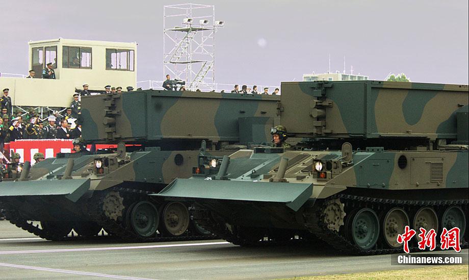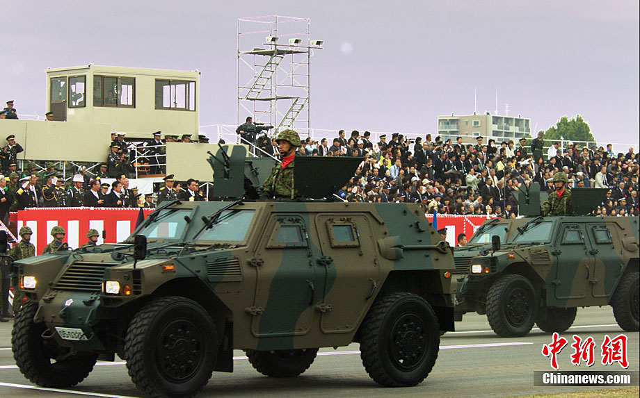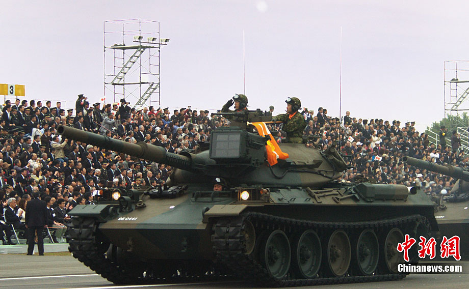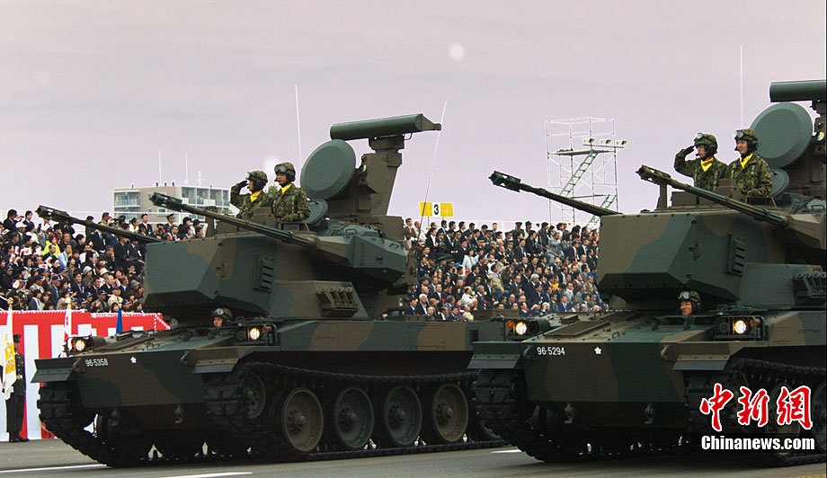 10月24日,日本自衛(wèi)隊(duì)在位于埼玉縣的朝霞訓(xùn)練場舉行了三年一度的海陸空閱兵式,首相菅直人檢閱了部隊(duì)并訓(xùn)話。參加本次閱兵式的自衛(wèi)隊(duì)員共有3800余人,分別來自海、陸、空3軍的26支部隊(duì)。閱兵式上,自衛(wèi)隊(duì)展示了各式戰(zhàn)機(jī)60余架,坦克、裝甲車等240輛。