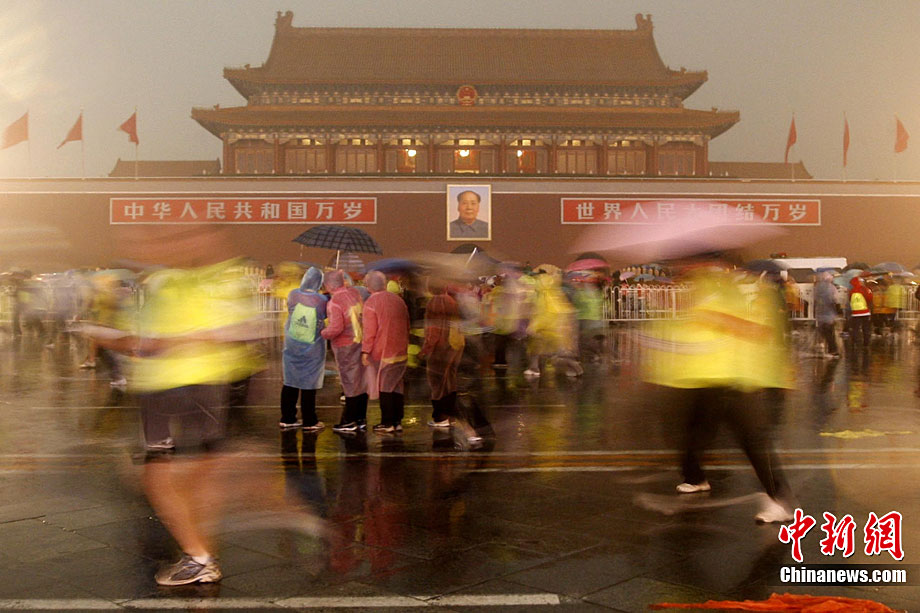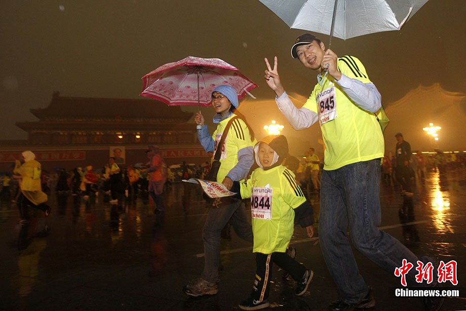 10月24日8時,2010年北京馬拉松正式鳴槍,所有參賽運動員在淅淅瀝瀝的小雨中從天安門廣場出發(fā)。今年的北京馬拉松正式與國際接軌,與往年不同的特點是北京馬拉松賽、全國馬拉松錦標賽以及首都高校馬拉松賽“三賽合一”,并采取一次發(fā)槍制,所有組別的選手都同時出發(fā)。中新社記者 富田 攝