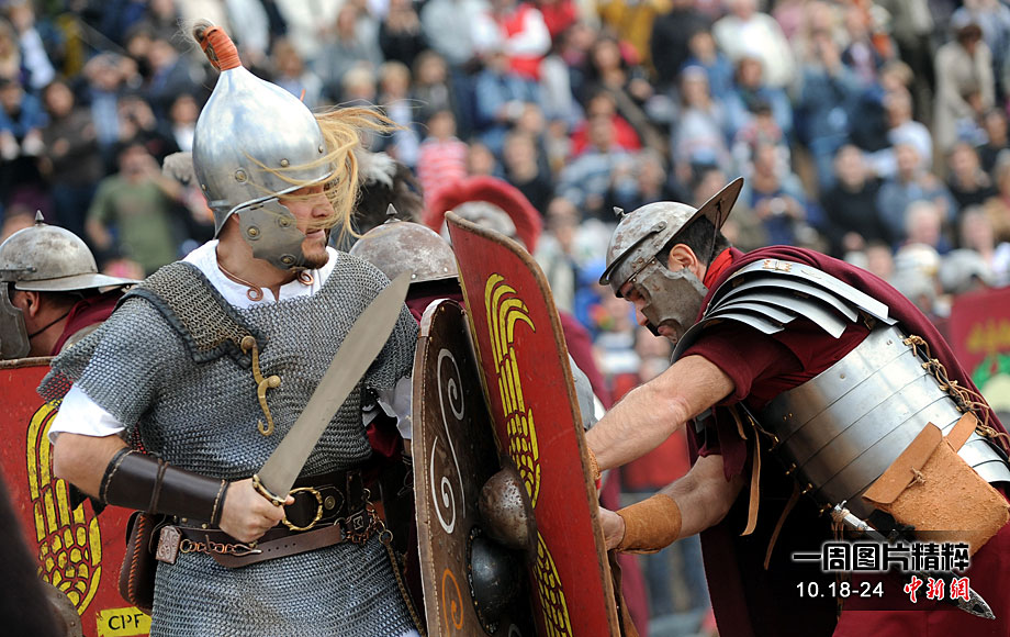 當(dāng)?shù)貢r間2010年10月17日,意大利羅馬的歷史愛好者和演員們再現(xiàn)了“古羅馬軍團”和凱爾特人戰(zhàn)斗的場景,表演吸引了大批觀眾到場觀看。