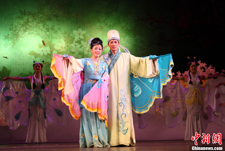 10月24日下午,朝鮮平壤大劇場(chǎng)上演其新排演的歌劇《梁山伯與祝英臺(tái)》。為紀(jì)念中國(guó)人民志愿軍赴朝參戰(zhàn)60周年,朝鮮血海歌劇團(tuán)把中國(guó)民間傳說(shuō)《梁山伯與祝英臺(tái)》改編成歌劇。圖為該歌劇中“梁;钡木势。中新社發(fā) 孫自法 攝