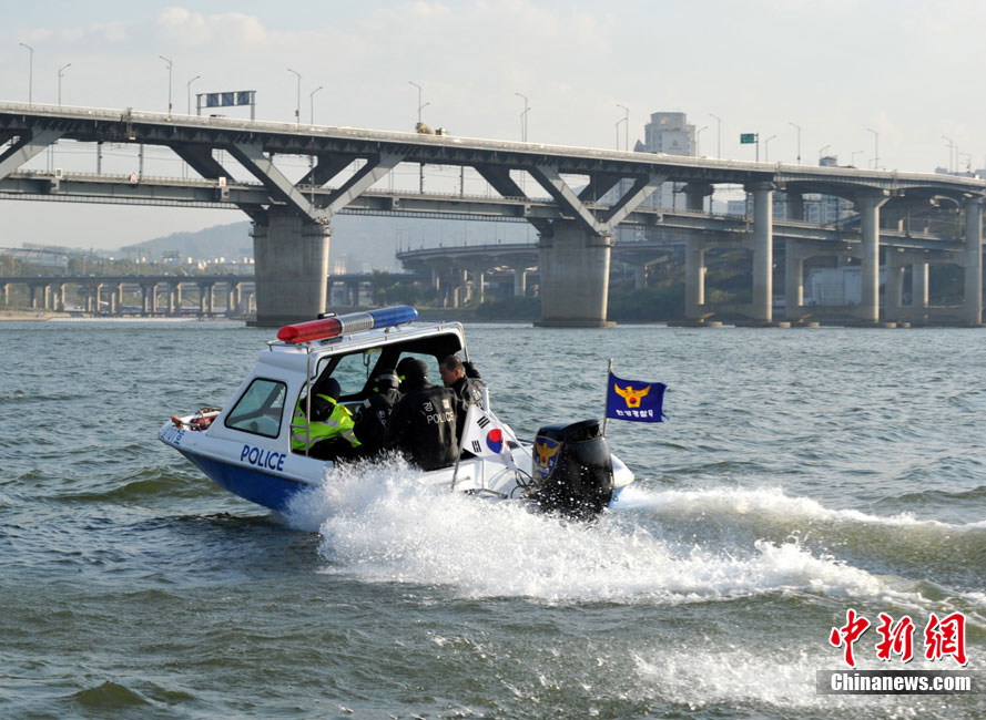 當(dāng)?shù)貢r(shí)間11月3日,韓國首爾附近的漢江中韓國水警舉行了針對G20峰會(huì)安保工作的演練。