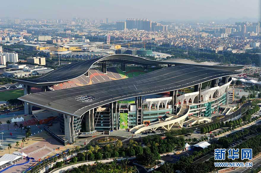 圖為航拍的廣東奧體游泳館(攝于10月29日)。在廣州亞運會期間,廣東奧林匹克體育中心場館群將舉行田徑、游泳、射擊、網(wǎng)球、棒球等項目的比賽。劉大偉 攝 圖片來源:新華網(wǎng)