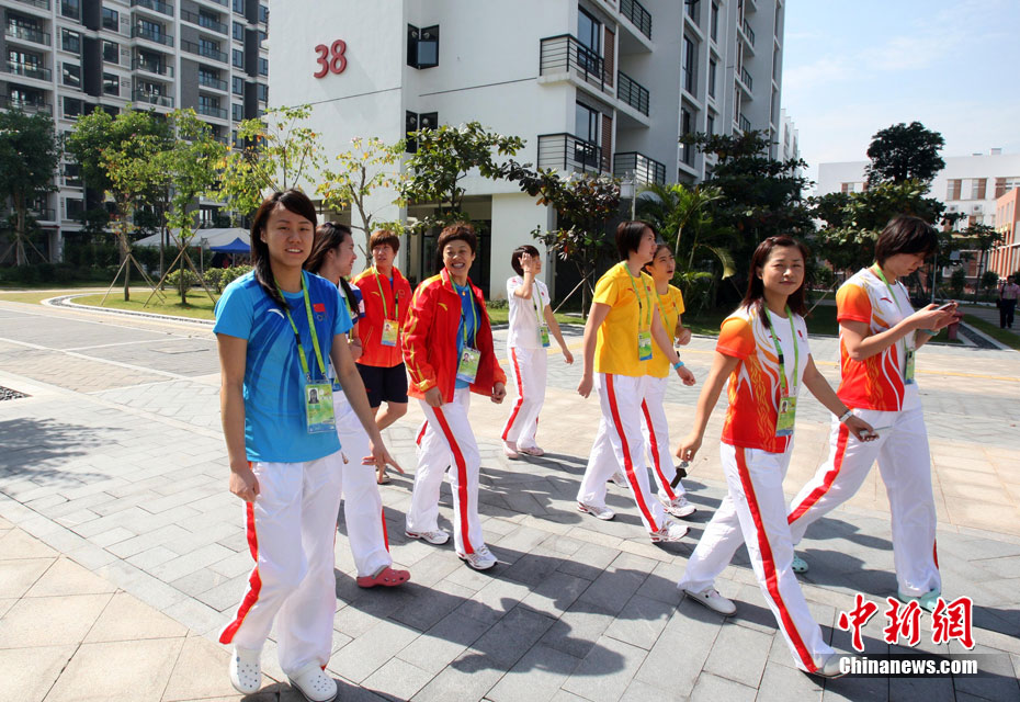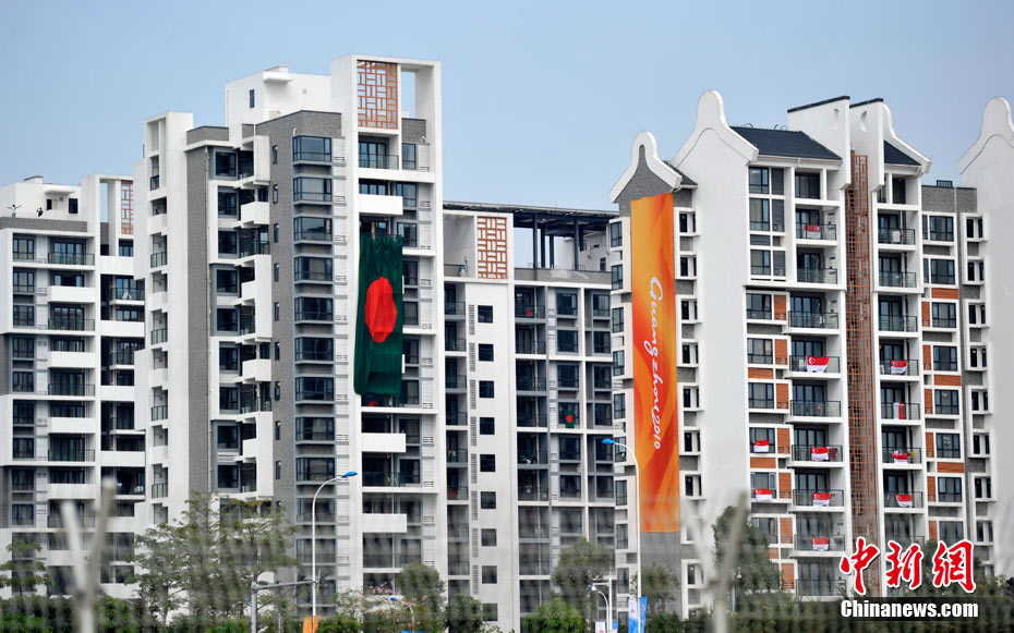 和歷屆亞運會不同,廣州亞運會沒有延續(xù)“亞運村”的概念,而是打造了一座亞運城,而運動員村則是亞運城的核心。運動員村位于亞運城內,總建筑面積59.1332萬平方米。運動員村共有49棟公寓樓、3598套公寓、9272間客房。應該說,運動員村是一個高度專業(yè)化、集約化和規(guī)范化的居住區(qū)域,這里將為運動員及隨隊官員提供住宿分配、客房、洗衣、布草洗滌、居民服務中心等住宿服務,全部是一條龍服務。圖為運動員公寓外景,不少運動員將自己國家的國旗懸掛在窗外。中新網(wǎng)記者 金碩 攝