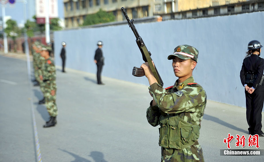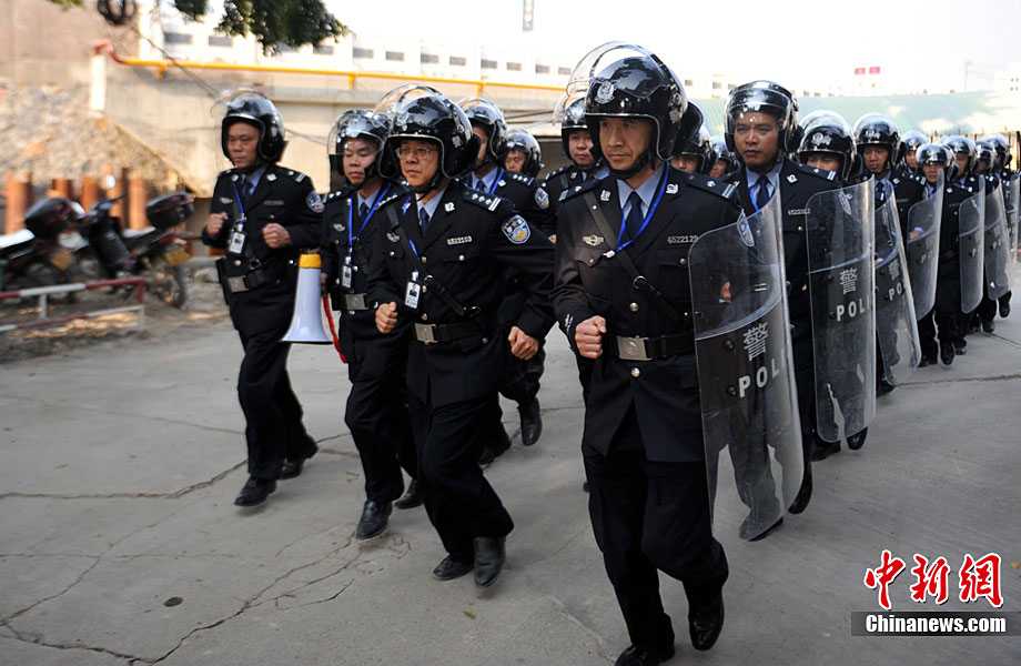 11月11日下午,為提高監(jiān)獄安全防范和及時有效處置突發(fā)事件的能力,廣西監(jiān)獄局組織駐南寧監(jiān)獄單位進(jìn)行了制暴追逃預(yù)案應(yīng)急處置實(shí)戰(zhàn)演練。本次制暴追逃演練是駐南寧市監(jiān)獄單位和武警、公安交警應(yīng)對突發(fā)事件的首次聯(lián)合大練兵。參與警力達(dá)260余人!笆掳l(fā)監(jiān)獄”在周邊監(jiān)獄單位、武警官兵、公安民警的權(quán)利配合下,成功處置4名“罪犯”企圖制造騷亂、趁機(jī)越獄脫逃“事件”。中新社記者 蔣雪林 攝