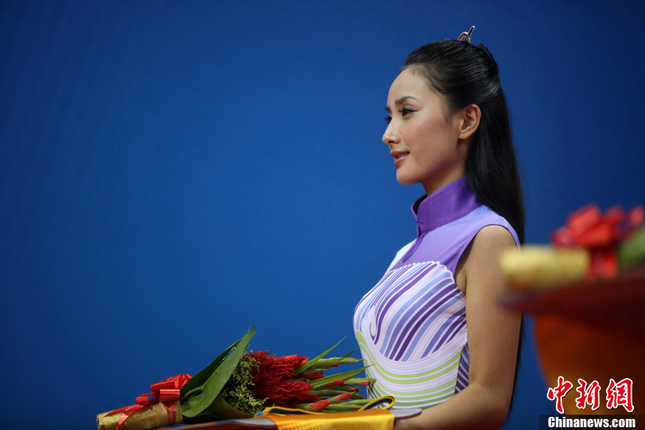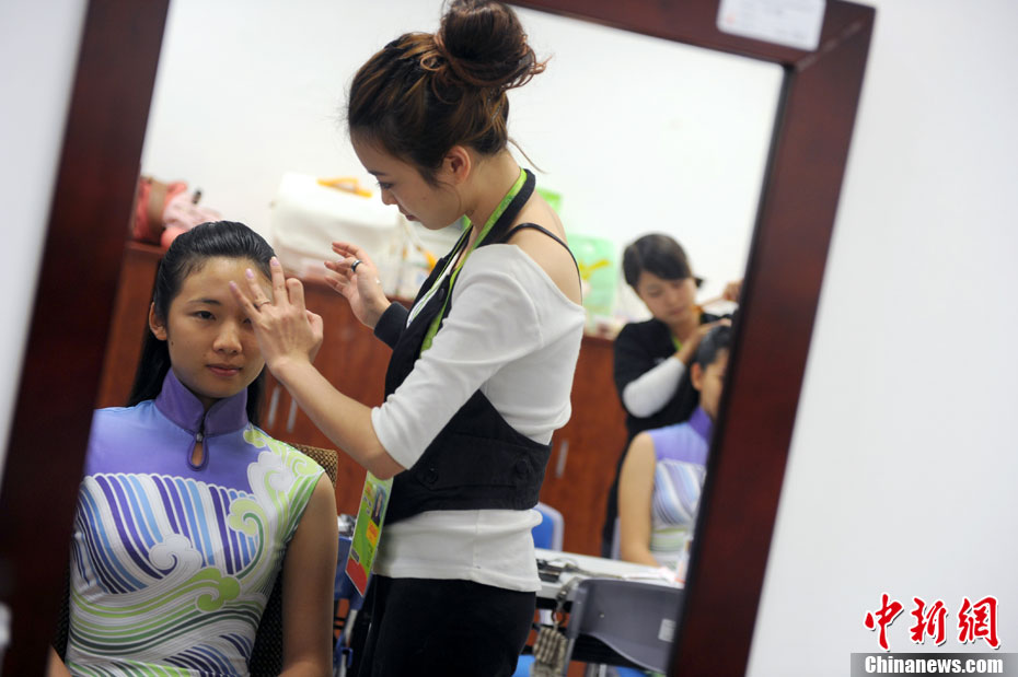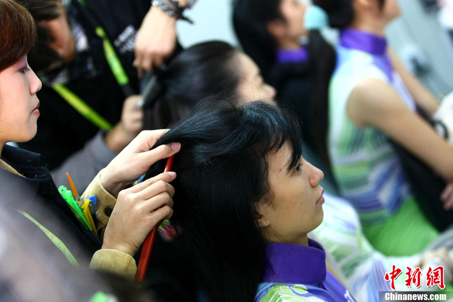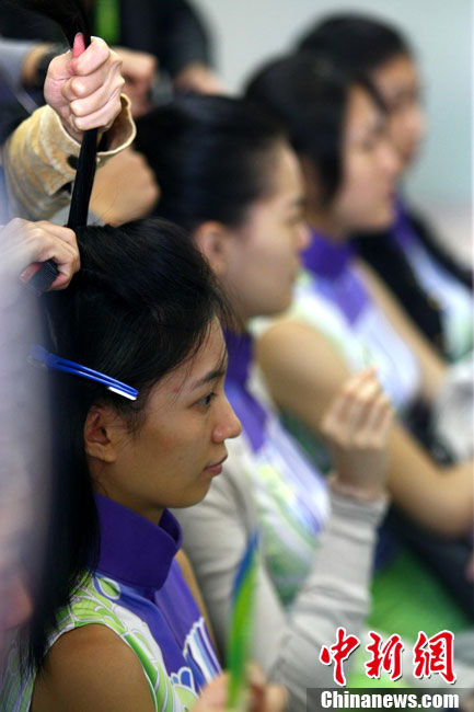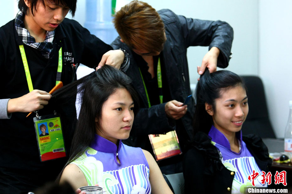 廣州亞運(yùn)會(huì)比賽開始后,對(duì)于這些美麗的姑娘們“戰(zhàn)斗”才剛剛打響,她們每天早上6點(diǎn)半就起床,趕到賽場(chǎng),開始4個(gè)小時(shí)的準(zhǔn)備工作——化妝、做頭發(fā)、整體造型,這一切都為頒獎(jiǎng)典禮的那短短一刻。