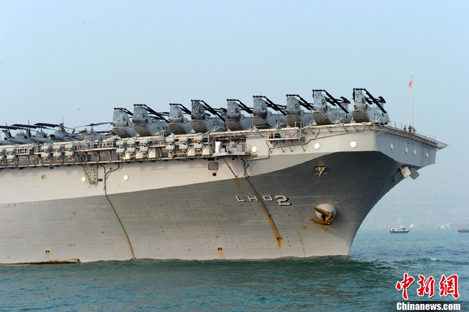 有“鋼鐵短吻鱷”之稱的“埃塞克斯”號,搭載有AV-8B“鷂”式戰(zhàn)機、CH-53E“海上種馬”直升機、CH-46E“海上騎士”直升機、UH-1N超級休伊直升機等逾30架各型機型,以及超過2200名船員和海軍官兵。中新網(wǎng)記者 鄭祚聲 攝