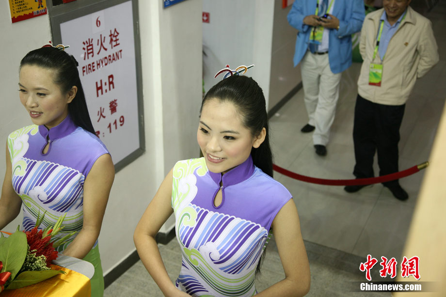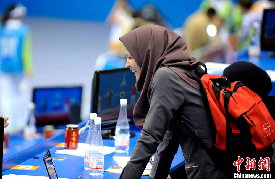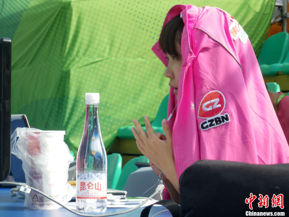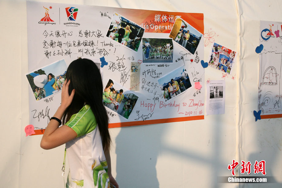 11月17日,廣州亞運(yùn)會(huì)舉重比賽在東莞體育館舉行,為賽事提供服務(wù)的志愿者們?cè)谛侣動(dòng)浾吖ぷ鏖g邊樹起了一塊圖版,記錄下志愿者生活的點(diǎn)點(diǎn)滴滴。中新社記者 沈晨 攝