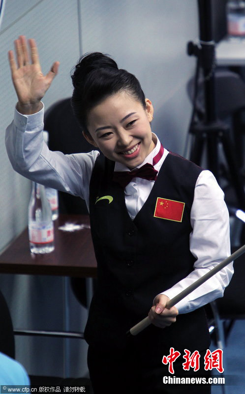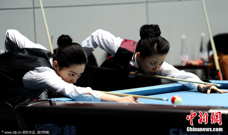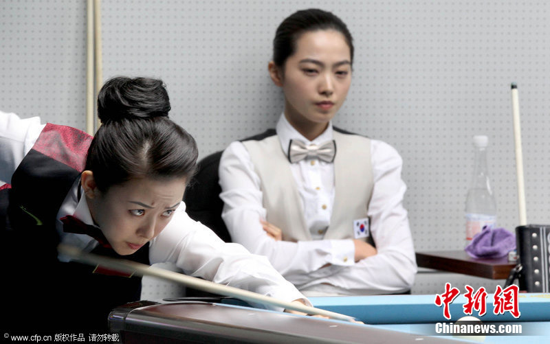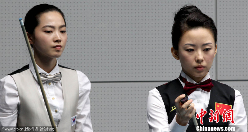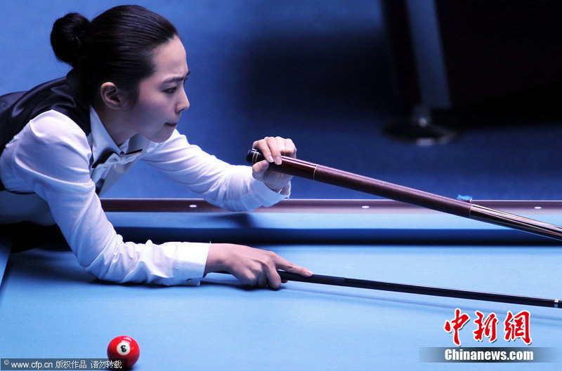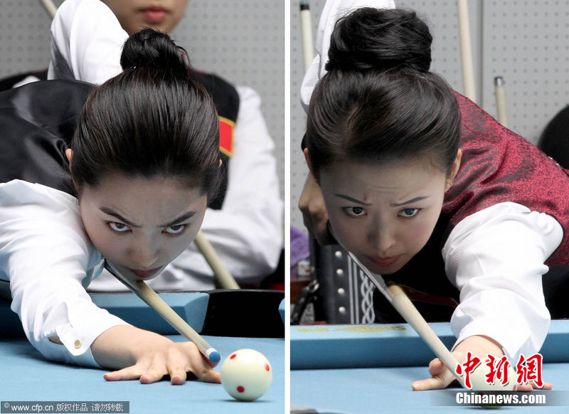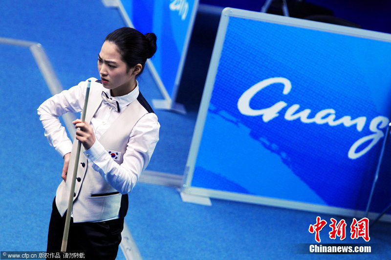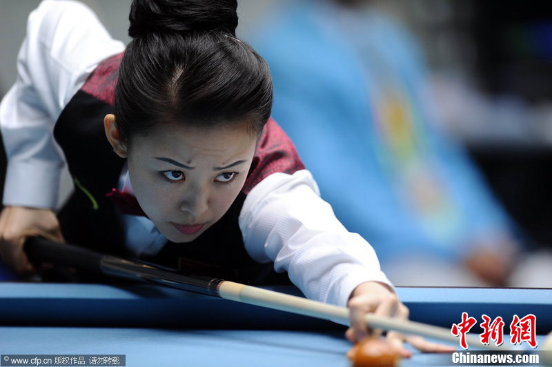 11月18日,2010廣州亞運(yùn)會(huì)女子美式9球單打1/4決賽,兩位公認(rèn)的臺(tái)壇美女展開(kāi)激烈爭(zhēng)奪,最終,中國(guó)選手潘曉婷以7:6的最終比分戰(zhàn)勝韓國(guó)的車(chē)侑藍(lán)(車(chē)俞嵐)晉級(jí)下一輪。圖片來(lái)源:cfp視覺(jué)中國(guó)