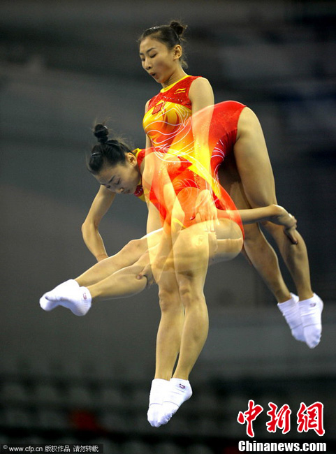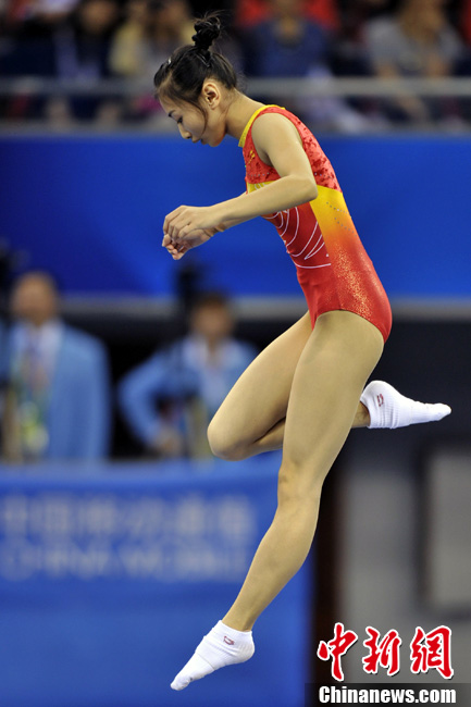 11月21日上午,廣州亞運(yùn)會(huì)蹦床個(gè)人資格賽在亞運(yùn)城體育館上演,中國女子選手何雯娜、黃珊汕;男子選手選手董棟、涂瀟全部順利晉級(jí)決賽。圖為何雯娜亮相亞運(yùn)城體育館。中新網(wǎng)記者 金碩 攝