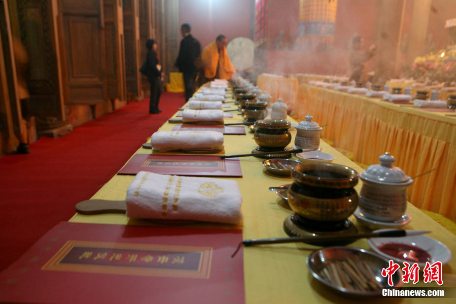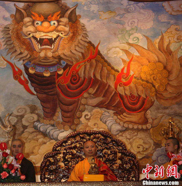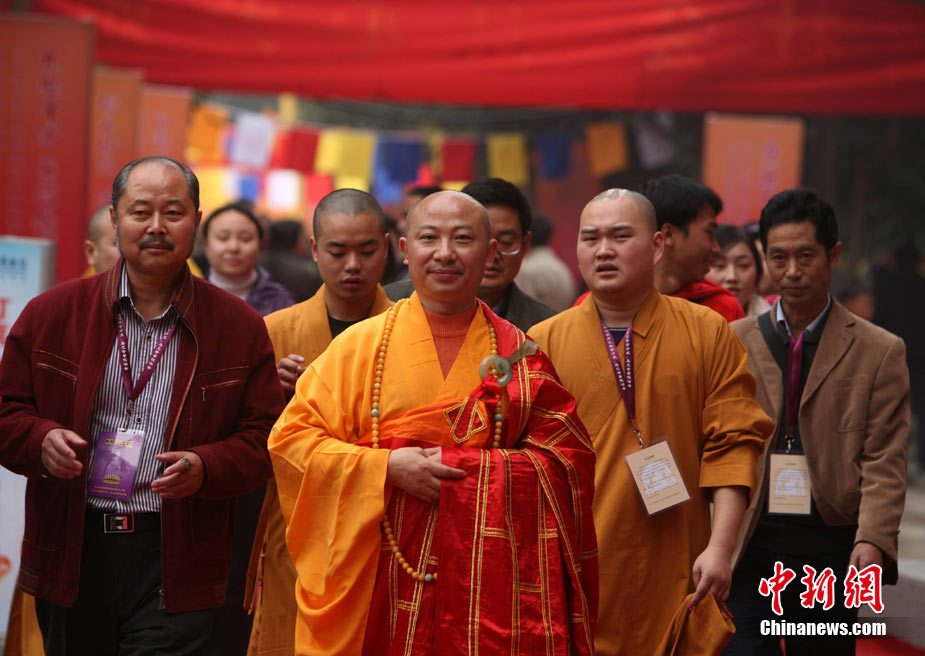 11月21日,“樂山凌云寺重光暨照觀法師榮膺凌云寺方丈、烏尤寺晉院升座法會(huì)”在四川樂山凌云寺、烏尤寺舉行。這標(biāo)志著有著1400年的千年名寺凌云寺經(jīng)歷“5·12” 汶川大地震的劫難后再現(xiàn)昔日光彩。圖為樂山凌云寺重光法會(huì)現(xiàn)場(chǎng)。中新社發(fā) 劉忠俊 攝