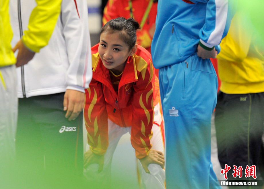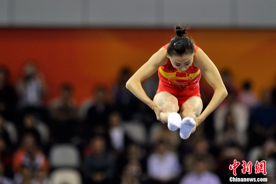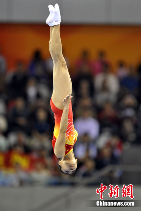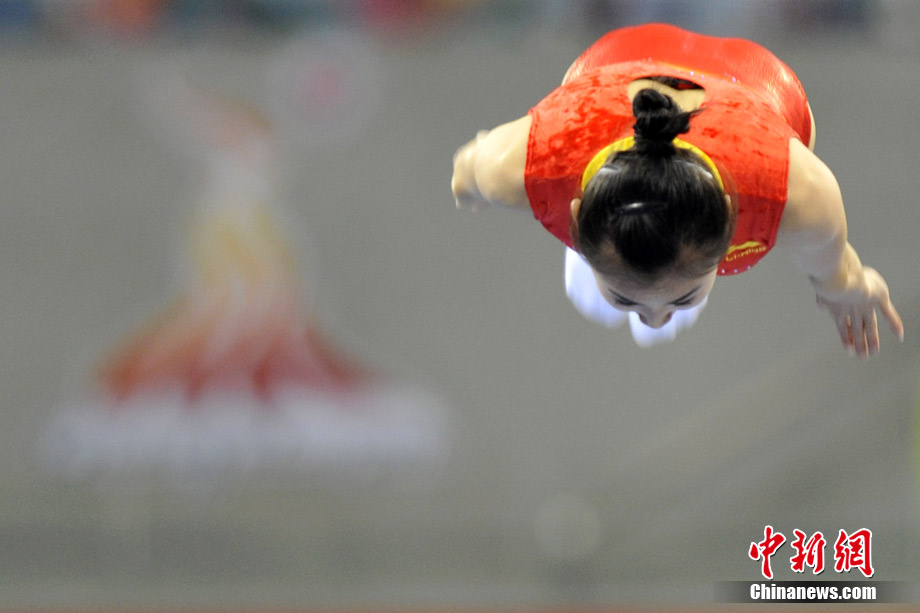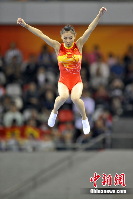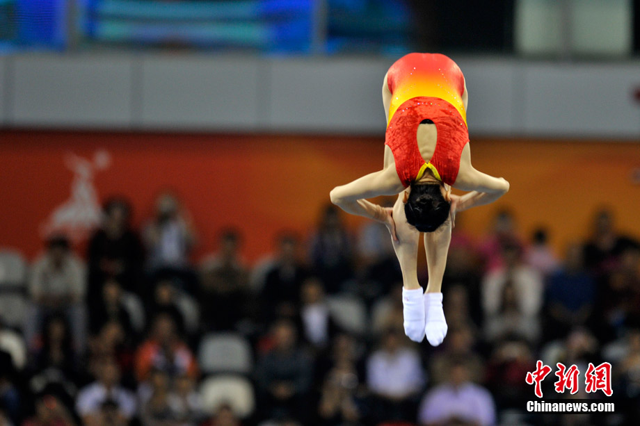 11月22日,廣州亞運(yùn)會(huì)蹦床決賽在亞運(yùn)城體育館舉行,“蹦床公主”何雯娜總分40.90獲得銀牌,隊(duì)友黃珊汕總分41.40摘得金牌。中新網(wǎng)記者 金碩 攝