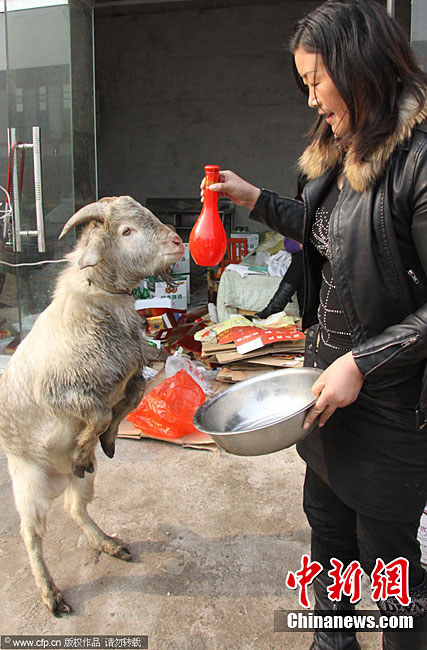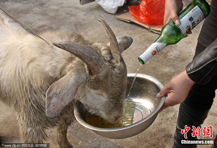 11月29日,在山東省臨沂市羅莊區(qū)盛莊街道,“酒鬼山羊”在大口喝酒。據(jù)悉,臨沂市羅莊區(qū)盛莊街道亓女士家養(yǎng)了一只波爾山羊,平時和狗拴在一起,經(jīng)常用酒店的剩飯菜喂狗,兩個月前,亓女士發(fā)現(xiàn)這只山羊開始和狗爭食吃,雞魚肉蛋樣樣品嘗,看熱鬧的村民試著用酒喂食,沒想這只山羊?qū)ζ【坪桶拙苼碚卟痪,而且酒后還撒潑到處頂撞人。朱武濤 攝 圖片來源:CFP視覺中國