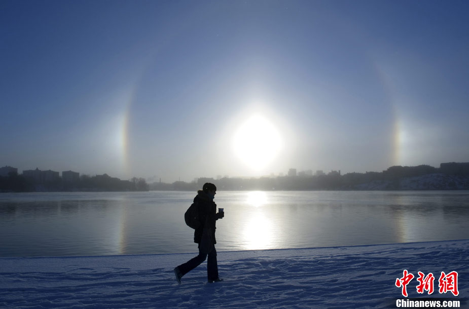 11月30日,瑞典斯德哥爾摩,梅拉倫湖上空出現(xiàn)幻日現(xiàn)象;萌宅F(xiàn)象是一種罕見(jiàn)的光暈現(xiàn)象,日光在大氣層中的冰微粒上發(fā)生反射、折射和衍射就可能產(chǎn)生幻日。