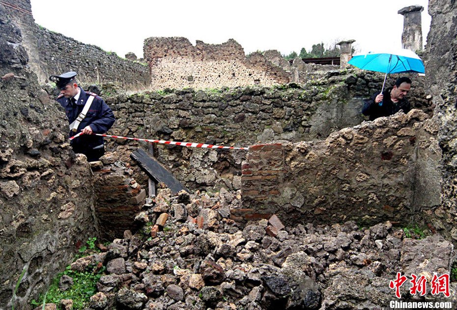 11月30日,有兩千多年歷史的龐貝古城一處古建筑的墻壁發(fā)生坍塌,當(dāng)?shù)乜脊艑?zhuān)家稱(chēng),這是由于連日來(lái)的持續(xù)降雨所致,不過(guò)倒塌的墻壁上沒(méi)有壁畫(huà)。就在此前一天,同樣由于降雨,龐貝古城的“道德者之家”外墻也發(fā)生倒塌。所幸這堵巖石外墻距離“道德者之家”還有一段距離,坍塌沒(méi)有威脅到建筑外墻的著名題詞。這兩起建筑倒塌事件被視為近期龐貝古建筑的“新傷”。圖片來(lái)源:CFP/視覺(jué)中國(guó)