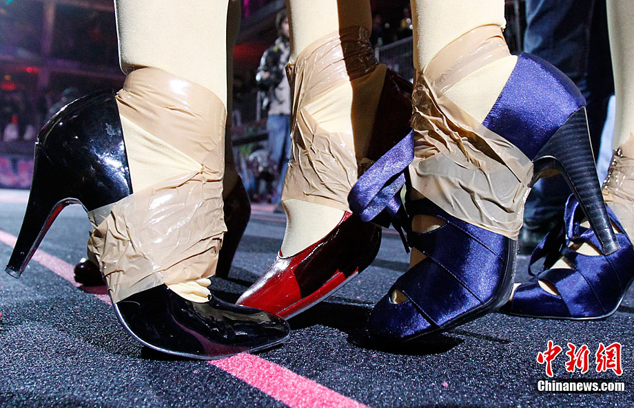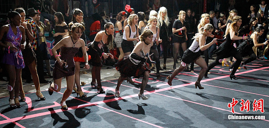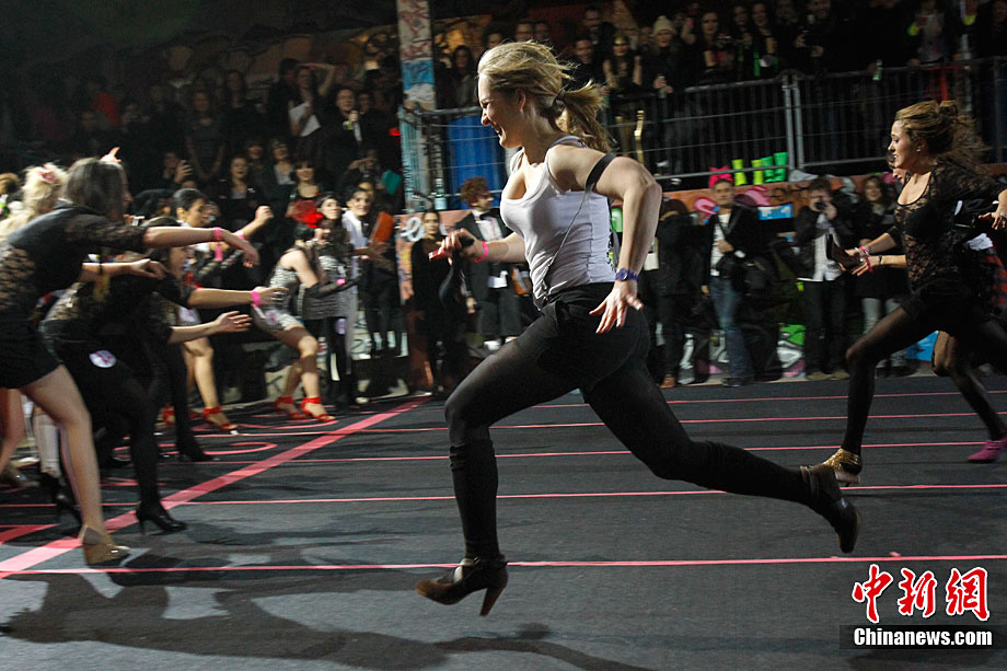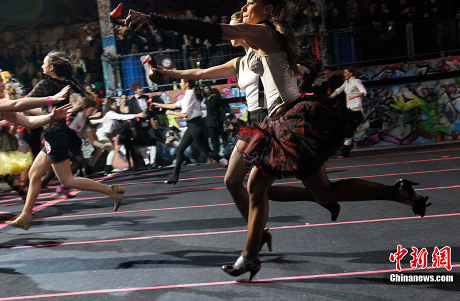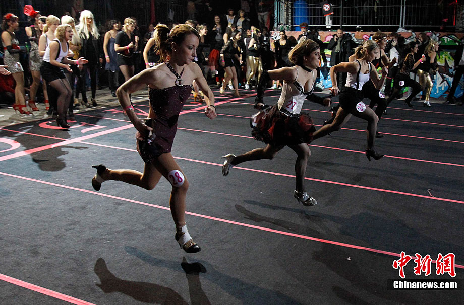 近日,第三屆Sarenza高跟鞋短跑比賽在法國巴黎舉行。來自法國和英國的選手參加了3×60米接力比賽。據(jù)悉,要想?yún)⒓舆@項趣味比賽,參賽者所穿的高跟鞋不得低于8厘米。