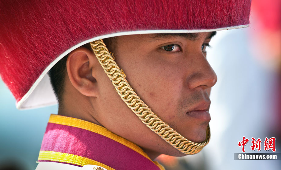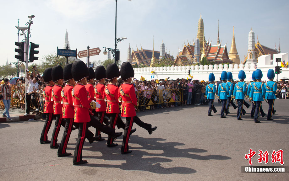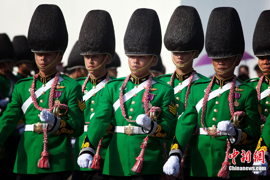 當(dāng)?shù)貢r(shí)間12月5日,泰國(guó)各界齊聚曼谷市中心的大王宮,慶祝泰王普密蓬83歲大壽。泰國(guó)皇家衛(wèi)隊(duì)士兵身著紅、綠、黑、蘭等各種顏色的軍服進(jìn)行游行,為泰王慶祝生日。