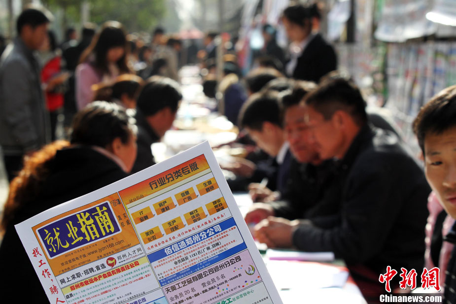 12月11日,年終歲末,在河南省人才市場的馬路上招牌用工者的美女招聘者坐成排等候應聘者前來咨詢。許多企業(yè)反映,每到年底都有部分員工請假回家相親結(jié)婚或與家人團聚過年,造成工廠人手不夠。