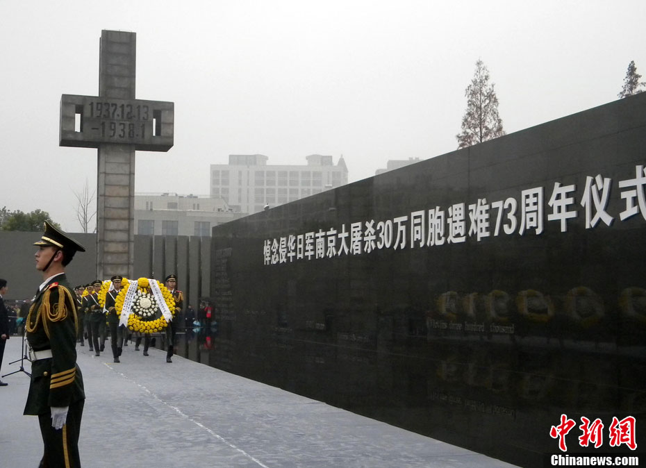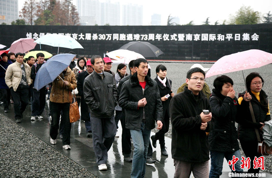 12月13日是南京大屠殺遇難同胞73周年祭日,12日起,江蘇南京將舉行和平集會、和平法會等系列活動,悼念30萬遇難同胞。圖為南京市民12日冒雨前往南京大屠殺遇難同胞紀念館悼念。 鐘山 攝 圖片來源:CNSPHOTO