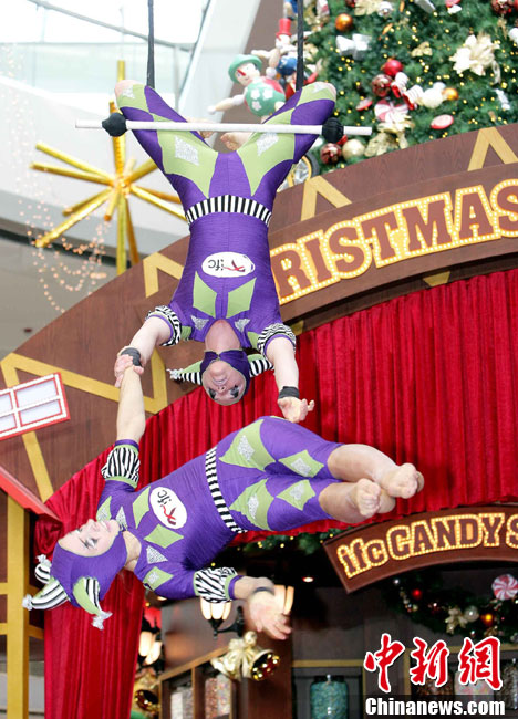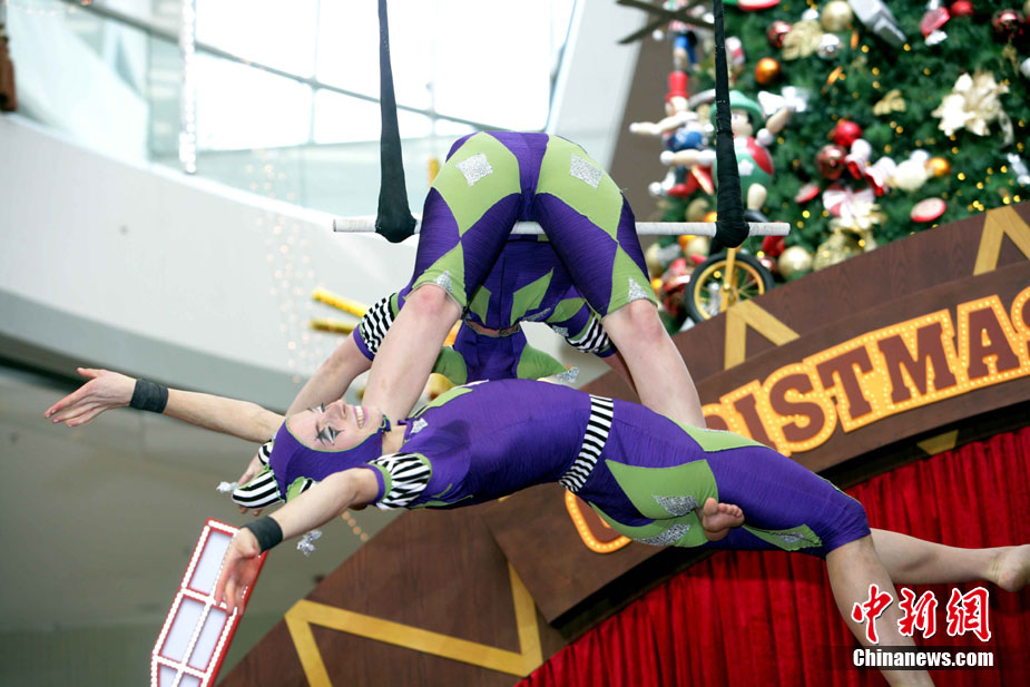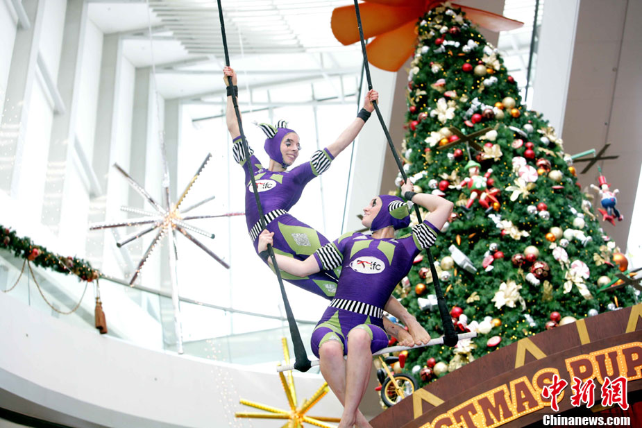 12月14日,香港國際金融中心上演震撼視覺的高空特技。首次來港獻藝的美國著名雜技團D Squared Trapeze在圣誕樂園內(nèi)打造雙人空中秋千,凌空飛舞表演,帶給觀眾“飛一般”夢幻體驗。中新社發(fā) 洪少葵 攝