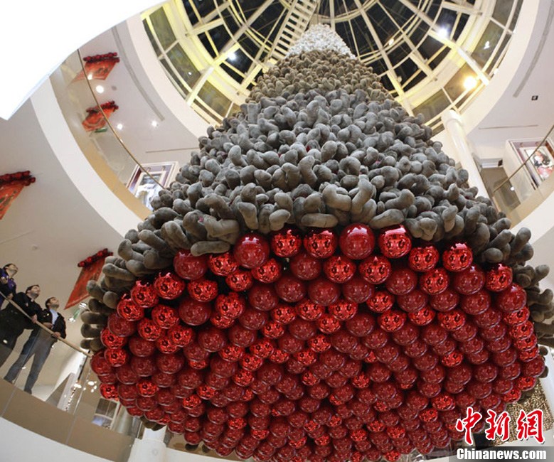 12月20日,在黎巴嫩首都貝魯特一家商場(chǎng),上千只泰迪熊組成的圣誕樹(shù)狀裝飾物懸掛在天花板上。在圣誕即將到來(lái)之際,黎巴嫩首都貝魯特舉行了一項(xiàng)名為“小小的熊,大大的心”的慈善活動(dòng),出售2000只泰迪熊的收益將會(huì)捐給黎巴嫩的自閉癥患者。