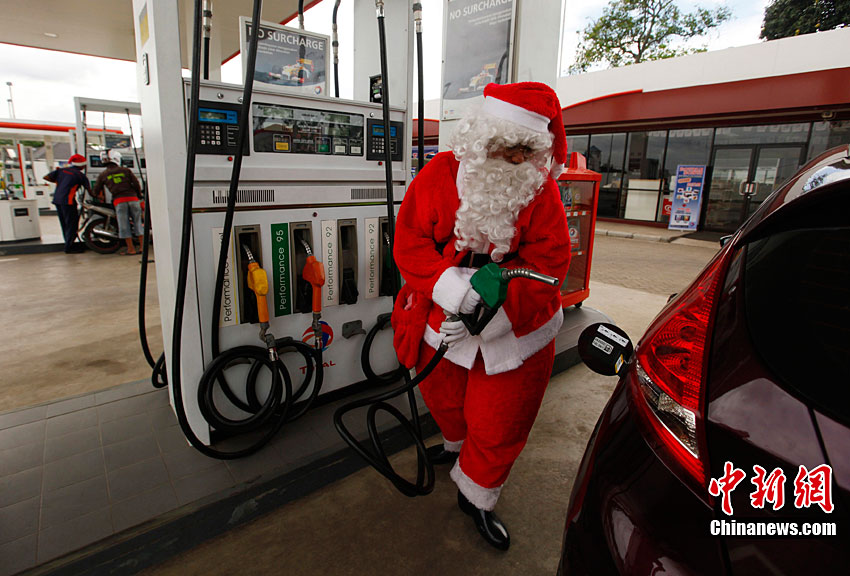 12月23日,印度尼西亞坦格朗市的一座加油站內(nèi),工作人員身著圣誕老人的服裝,為過往車輛加油、洗車。