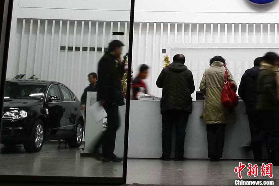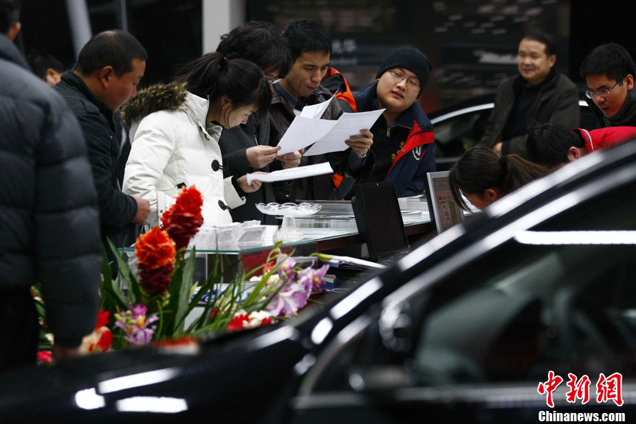 12月23日夜,北京民眾連夜排隊(duì)購(gòu)置新車。當(dāng)日下午,北京市人民政府新聞辦公室召開“北京交通改善措施”新聞發(fā)布會(huì),正式公布了《關(guān)于進(jìn)一步推進(jìn)首都交通科學(xué)發(fā)展 加大力度緩解交通擁堵工作的意見》,將實(shí)行綜合措施治理交通擁堵。其中,2011年度北京小客車總量額度指標(biāo)控制為24萬(wàn)個(gè),牌照通過(guò)搖號(hào)無(wú)償分配的政策成為民眾關(guān)注的焦點(diǎn)。中新社記者 富田 攝