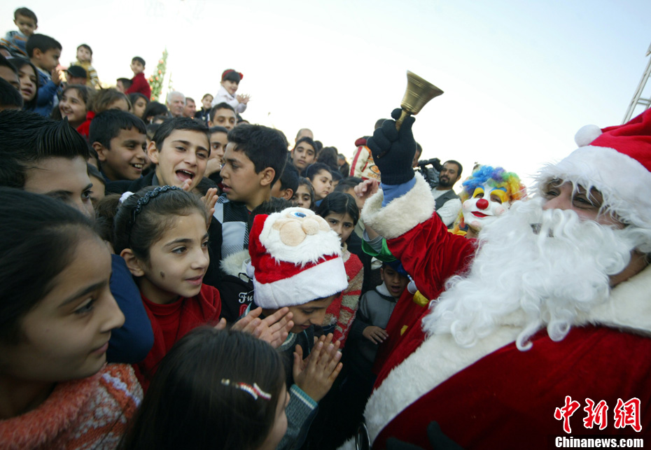 當(dāng)?shù)貢r(shí)間12月24日,伊拉克庫爾德人聚集地圣誕老人為孩子們送去歡樂。