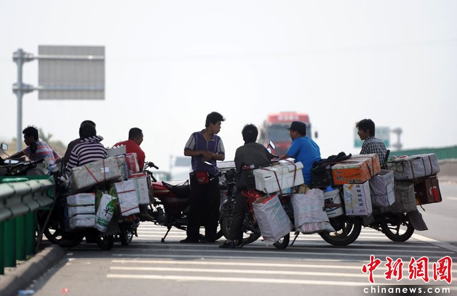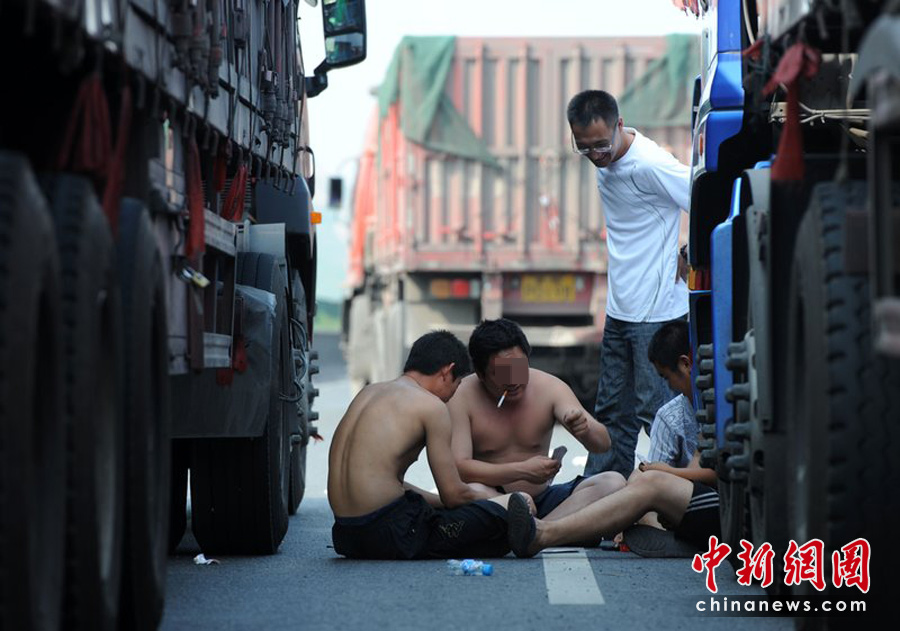 6月21日,施工20天的110國(guó)道延慶縣境內(nèi)的四座橋梁維修完畢,道路恢復(fù)暢通,但擁堵了20多天的京新高速,緩解情況卻不大。幾小時(shí)走上兩三公里的速度,實(shí)在讓人難以忍受,但長(zhǎng)期跑這趟線路的大貨車車司機(jī)稱,車能走動(dòng),就已經(jīng)慶幸了,僅僅10幾公里的路,被堵三天三夜的情況以前是經(jīng)常出現(xiàn)。圖為23日在滯留的車隊(duì)中,不斷有開(kāi)著摩托車的小販在大貨車之間穿插以做點(diǎn)生意。王苡萱/CFP