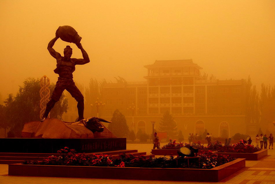 6月27日,甘肅民勤城區(qū)遭到沙塵襲擊。當(dāng)日下午4時左右,甘肅省武威市民勤縣又遭沙塵暴襲擊,黃黑的沙塵迅速籠罩整個縣城,能見度大幅降低。今年4月24日甘肅民勤曾遭特大沙塵暴襲擊。 圖片來源:新華網(wǎng) 李軍 攝