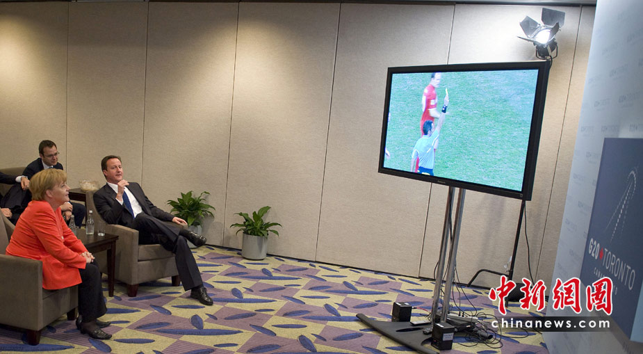 6月27日,正在加拿大參加G20領(lǐng)導(dǎo)人峰會(huì)的德國(guó)總理默克爾和英國(guó)首相卡梅倫,一同觀看了世界杯英格蘭與德國(guó)隊(duì)的比賽。