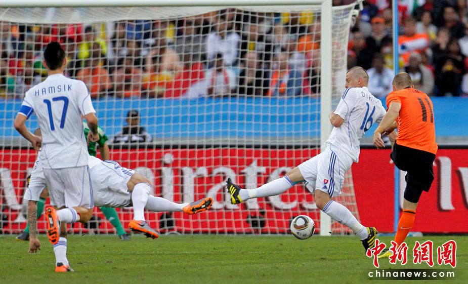 28日晚,南非世界杯1/8決賽第五場(chǎng)比賽在德班球場(chǎng)拉開戰(zhàn)幕,由E組頭名荷蘭隊(duì)迎戰(zhàn)F2第二名斯洛伐克。最終,憑借羅本和斯內(nèi)德在上下半場(chǎng)的進(jìn)球,荷蘭隊(duì)以2-1淘汰斯洛伐克,闖入八強(qiáng)。