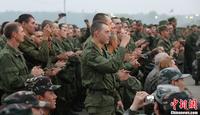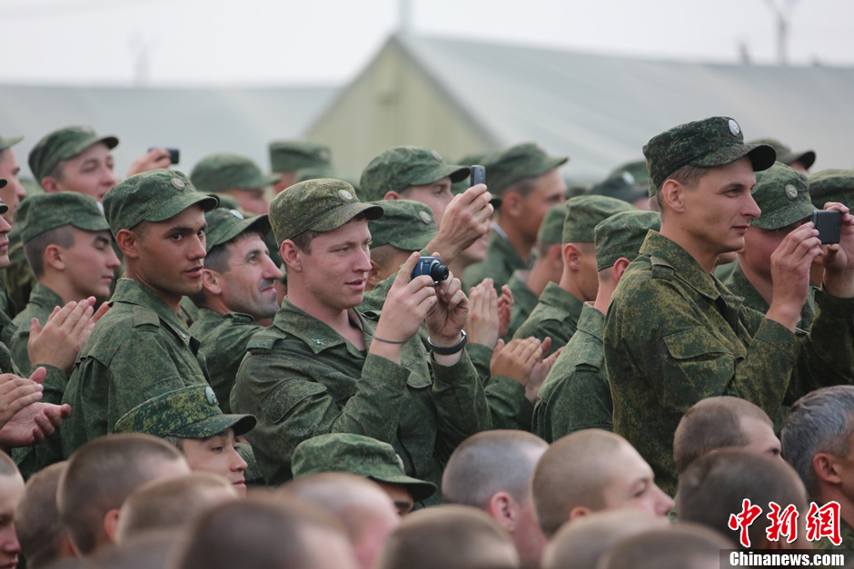 8月10日,隨同中方參演部隊赴俄羅斯參加“和平使命-2013”中俄聯(lián)演的沈陽軍區(qū)政治部文工團(tuán)演員們,為中俄千余名參演官兵獻(xiàn)上了一場精彩的文藝晚會。豐富多彩的文藝節(jié)目,將位于切巴爾庫爾訓(xùn)練場的中俄聯(lián)演野營村,變成了友誼的盛會、歡樂的海洋。 圖為精彩節(jié)目吸引俄國官兵。中新社發(fā) 李祥輝 攝