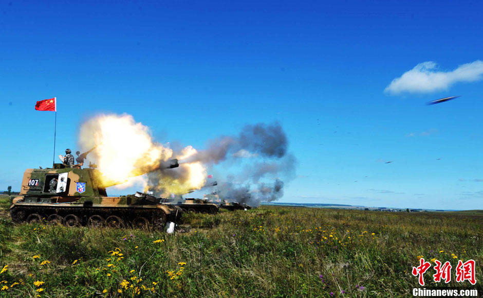 8月12日12時(北京時間下午2時),“和平使命-2013”中俄聯(lián)合反恐軍事演習,在俄羅斯切巴爾庫爾合同訓練場進行了實兵實彈協(xié)同訓練,中俄雙方出動了所有參演兵力,對聯(lián)合封控、分區(qū)清剿、火力突擊等內容進行了訓練,時間大約50多分鐘。圖為中方炮火實施遠程火力攔阻。中新社發(fā) 譚長俊 攝