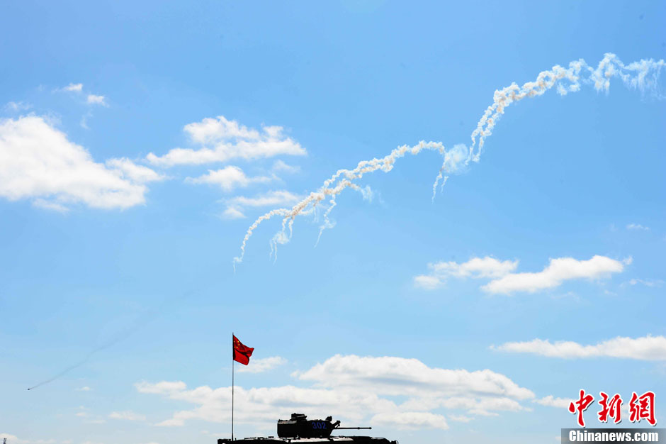 8月12日12時(北京時間下午2時),“和平使命-2013”中俄聯(lián)合反恐軍事演習,在俄羅斯切巴爾庫爾合同訓練場進行了實兵實彈協(xié)同訓練。圖為陸空協(xié)同對敵實施打擊。中新社發(fā) 譚長俊 攝