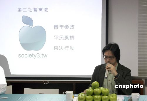 臺灣第三社會黨十八日公布青蘋果造型的黨徽,象征“青年參政,平民風格,果決行動”。第三社會黨籌備處負責人周奕成(圖中講話者)表示,青蘋果構想來自知名律師陳長文。中新社發(fā) 耿軍 攝