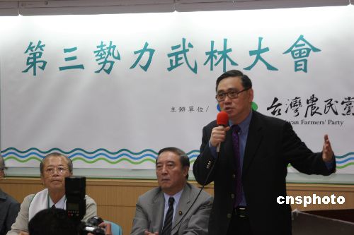 臺灣弱勢政黨十月二十五日在臺北召開“第三勢力武林大會”,呼吁“人民生計擺中間,政黨惡斗放兩邊”,宏仁集團(tuán)董事長王文洋(右一)在會上發(fā)言時大聲問到:“全世界都認(rèn)為中國大陸的市場非常重要,我們臺灣為什么不與大陸直航?為什么自己捆手捆腳?”中新社發(fā) 耿軍 攝