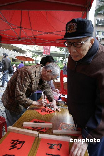 十二月十四日,二00七臺(tái)北眷村文化節(jié)開幕,老人們在活動(dòng)現(xiàn)場書寫對(duì)聯(lián)。中新社發(fā) 陳國華 攝