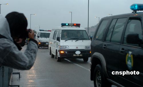 押解歐文龍的囚車(白色)在警車的護衛(wèi)下駛入澳門終審法院。