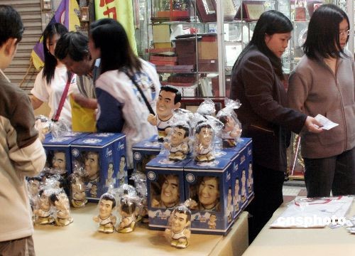 大批支持者在馬蕭競(jìng)選總部前集會(huì)歡慶。圖為集會(huì)現(xiàn)場(chǎng)不時(shí)有人購(gòu)買(mǎi)馬英九公仔。