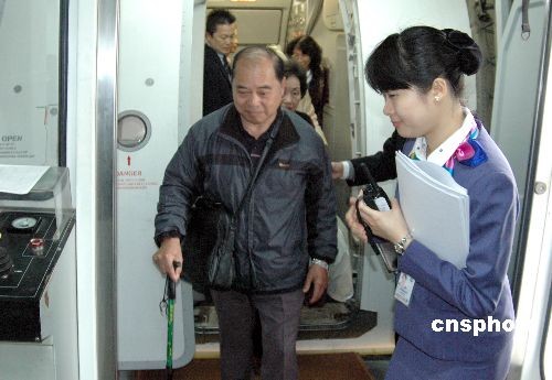 四月二日中午,臺(tái)灣復(fù)興航空公司兩岸清明包機(jī)抵達(dá)廈門(mén)機(jī)場(chǎng),揭開(kāi)本次兩岸清明包機(jī)廈門(mén)航點(diǎn)序幕。圖為服務(wù)人員精心照料年歲較大的臺(tái)胞乘客。中新社發(fā) 陳悅 攝