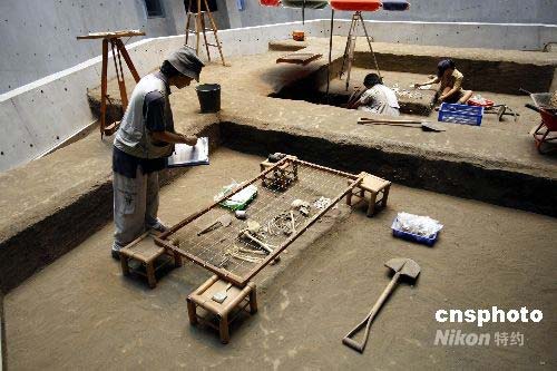 十三行博物館位于臺(tái)北縣八里鄉(xiāng)淡水河?诮唤缣幍哪习,面積約為62500平方公尺,在1989至1992年間,因?yàn)樵谶z址上興建八里污水處理廠,引發(fā)附近居民以及學(xué)者抗議。在社會(huì)輿論的聲援下,當(dāng)局一邊開挖古物、一邊興建污水處理廠,最後在廠內(nèi)保留出一塊古跡保護(hù)區(qū),并在污水處理廠旁建造十三行博物館,保存出土文物。 1957年地質(zhì)學(xué)者林朝綮在這里發(fā)現(xiàn)史前的煉鐵遺跡,同時(shí)亦發(fā)現(xiàn)許多史前陶片、石支腳與凹石等,因而判斷此處為史前遺址,并依據(jù)該地地名將它定名為十三行遺址。十三行人是目前臺(tái)灣唯一確定擁有煉鐵技術(shù)的史前居民,可能是臺(tái)灣平埔族凱達(dá)格蘭人的祖先。十三行文化屬于北臺(tái)灣地區(qū)的金屬器時(shí)代,時(shí)間大致從2300年前開始,到漢人進(jìn)入本地區(qū)之后才結(jié)束。圖為重現(xiàn)當(dāng)年考古發(fā)現(xiàn)的場(chǎng)景。中新社發(fā) 杜洋 攝
