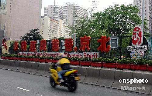 為迎接2008北京奧運(yùn),香港港九新界大街小巷精心布置,隨處可見迎接奧運(yùn)的標(biāo)志和旗幟。圖為五月一日,一位市民駕駛電單車經(jīng)過香港新界街道。中新社發(fā) 蔡蔓莉 攝