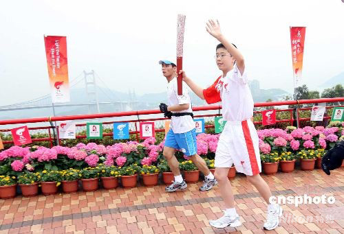 五月二日,奧運圣火在香港傳遞,手持北京奧運火炬的香港最年輕火炬手趙頌熙經(jīng)過香港地標(biāo)青馬大橋。中新社發(fā) 洪少葵 攝