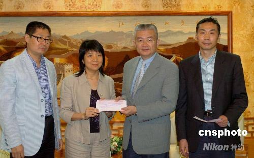 五月十三日,澳門(mén)中聯(lián)辦副主任徐澤(右二)接受盧德華女士(左二)交來(lái)的二十五萬(wàn)元港幣善款。這是五位澳門(mén)四川省政協(xié)委員捐助,用于救助四川地震災(zāi)民的善款。中新社發(fā) 史利 攝