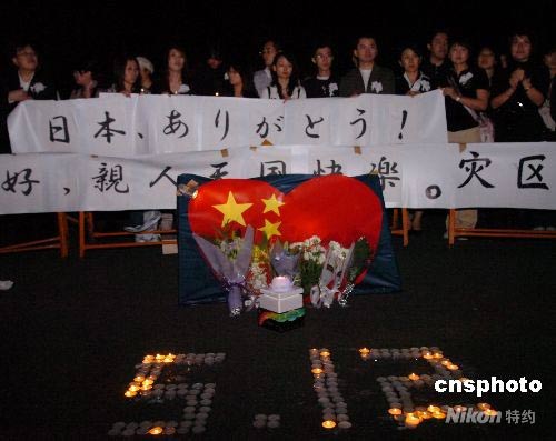 5月18日晚,150余位在日華人華僑和留學(xué)生自發(fā)來到東京市中心的新宿中央公園舉行燭光祈;顒,悼念5·12四川大地震遇難者。他們胸戴小白花、手持蠟燭,并打出“孩子一路走好”、“親人天國快樂”、“災(zāi)區(qū)人民挺住”等橫幅。中新社發(fā) 朱沿華 攝