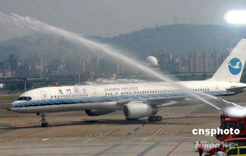 七月四日八時(shí)三十八分,兩岸周末包機(jī)大陸福建首發(fā)團(tuán)乘坐廈門航空公司B757客機(jī)抵達(dá)臺(tái)北松山機(jī)場(chǎng)。松山機(jī)場(chǎng)以噴水儀式為首發(fā)團(tuán)接風(fēng)洗塵。中新社發(fā) 徐長(zhǎng)安 攝