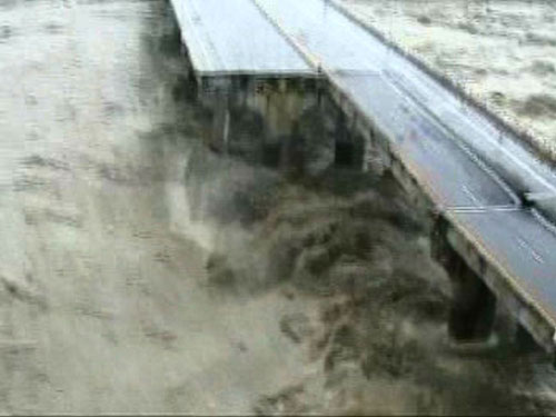 因森拉克臺(tái)風(fēng)豪雨影響,臺(tái)灣臺(tái)中縣后豐大橋日前發(fā)生斷裂垮塌,造成三車(chē)六人墜落橋下遭滾滾洪水沖走慘劇。圖為空中勤務(wù)總隊(duì)直升機(jī)空拍斷橋全景的鏡頭!爸醒肷纭眻D