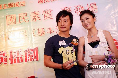 由香港政制及內(nèi)地事務(wù)局贊助,國民教育中心策劃,有關(guān)基本法及發(fā)揚(yáng)奧運(yùn)精神系列活動即將在香港推出。九月二十日,參與“一國兩制”與“基本法”廣播劇演出的影視紅星方力申、周麗淇出席記者會與青少年分享心得。中新社發(fā) 洪少葵 攝