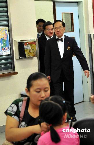 香港特區(qū)行政長(zhǎng)官曾蔭權(quán)二十三日下午,前往油麻地賽馬會(huì)分科診所,了解受三聚氰胺奶品事件影響兒童的檢驗(yàn)情況。中新社發(fā) 譚達(dá)明 攝