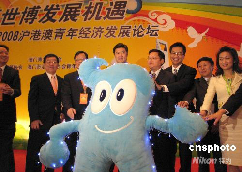 10月7日,“2008滬港澳青年經(jīng)濟(jì)發(fā)展論壇”在上海舉行。來自滬港澳三地的青年企業(yè)家、專家學(xué)者、學(xué)生領(lǐng)袖等400余人參加論壇,探討上海世博會的發(fā)展機(jī)遇與青年責(zé)任等話題。論壇由上海市青年聯(lián)合會、香港青年聯(lián)會、澳門青年聯(lián)合會等共同主辦,在上海、香港、澳門三地每年一屆、輪替舉行,今年為第十年。圖為滬港澳三地青年代表與上海世博會吉祥物“海寶”牽手,啟動論壇。中新社發(fā) 許曉青 攝